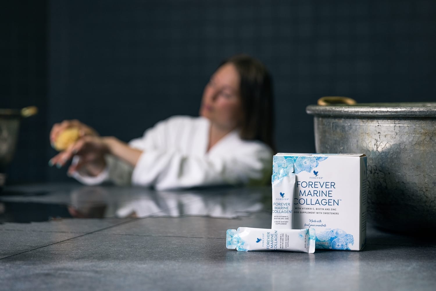 Forever Marine Collagen on ravintolisä, joka on suunniteltu ihon, hiusten ja kynsien tarpeisiin. Se sisältää meriperäisen kollageenin lisäksi A- ja C-vitamiineja, biotiinia, kivennäisaine sinkkiä ja Q10-koentsyymiä kätevissä annospakkauksissa.