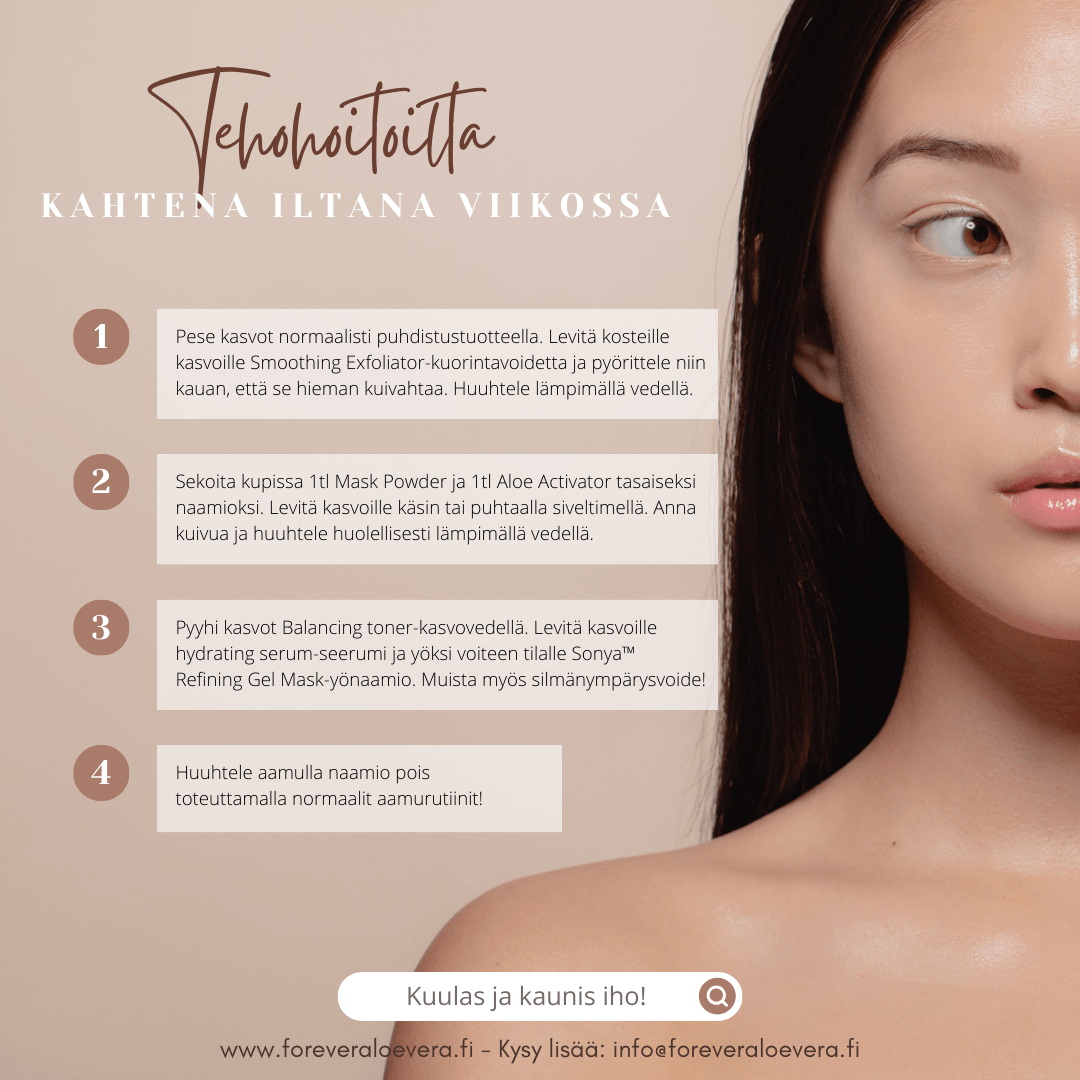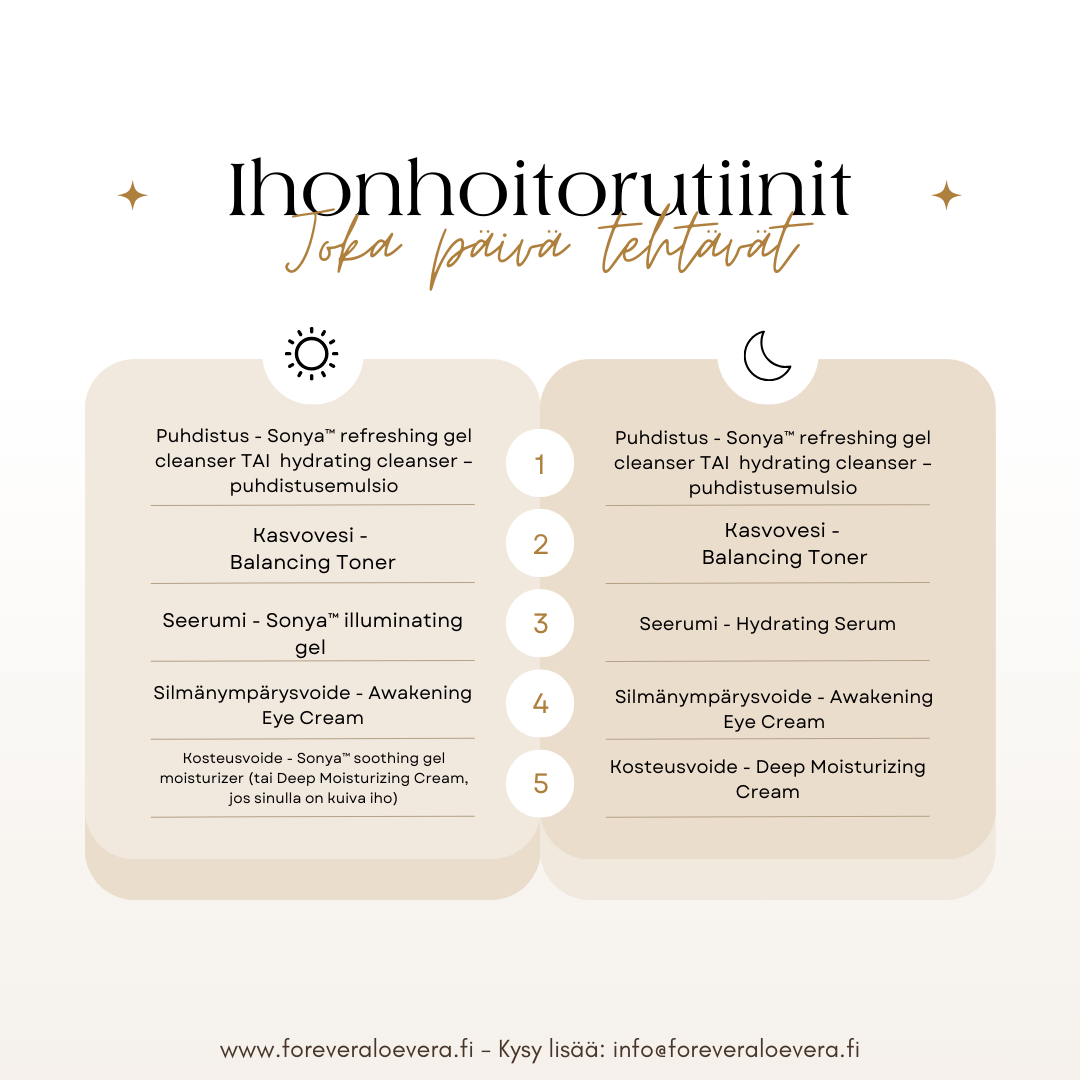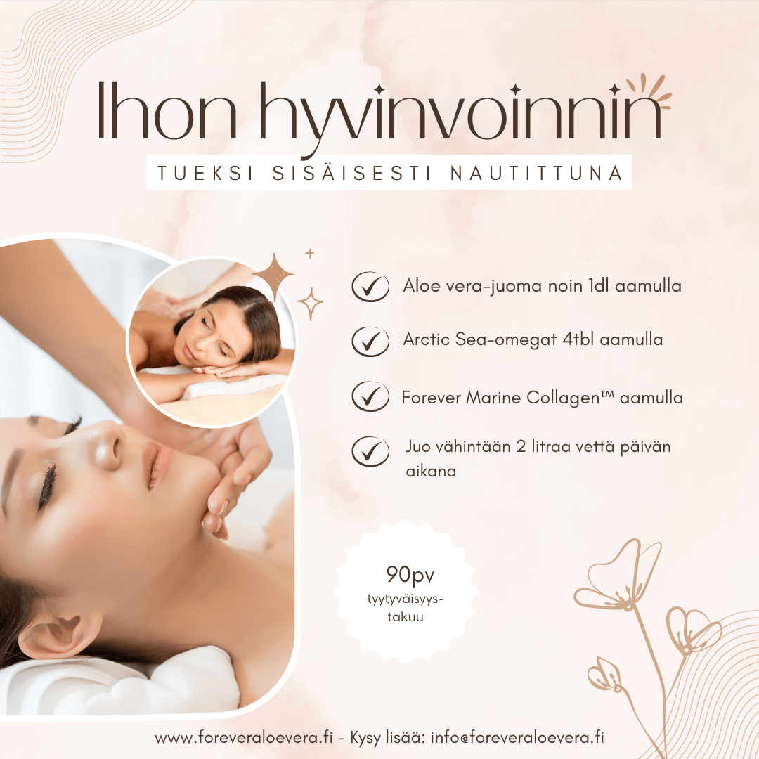 Yllä olen kirjoittanut kaikki ihonhoitooni kuuluvat tuotteet ja rutiinit. Näiden lisäksi pidän erityisen tärkeänä tukea ihon hyvinvointia myös sisäisesti käytettävillä ravintolisillä, jotka muutenkin tukevat hyvinvointiani ja jaksamistani. Alla on parhaimmat vinkkini tuotteista ihon hyväksi! Näillä, kuten myös kaikilla kosmetiikkatuotteilla on 90pv tyytyväisyystakuu! Suosittelen lämpimästi oman kokemukseni pohjalta myös sinua kokeilemaan tätä ihonhoito-ohjelmaani! Löydät kaikki tuotteet verkkokaupasta, klikkaamalla tästä! Autan sinua mielelläni, mikäli haluat saada tuotteista tai ohjelmasta lisätietoja!